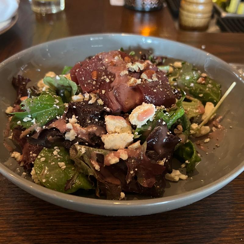 Spinach, red beets, butternut squash, raisins, candied pecans, crumbled goat cheese, maple dijon dressing.